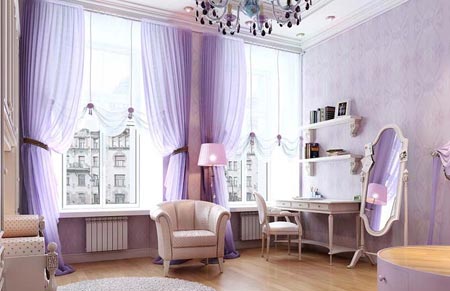 Здравствуйте, нужна Ваша помощь. Не могу определиться с цветов занавесок в комнате. Какого цвета выбрать тюль и шторы, если в комнате обои сиренево-лавандового цвета, а мебель в комнате белая (это спальня).
