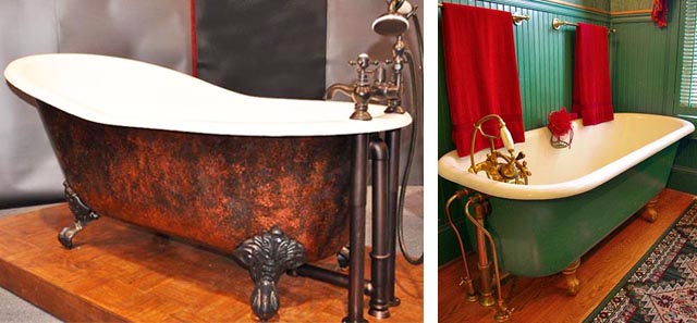 Очевидно, что первая ванна (состаренная) может быть установлена не только в винтажном, но и в ультрасовременном интерьере (для контраста), или в интерьере-фьюжн. А вот вторая ванна, с ее медными деталями, круглыми бортами и несовременной “толстой” формой, может быть установлена только в интерьере, имитирующем стиль модерн.